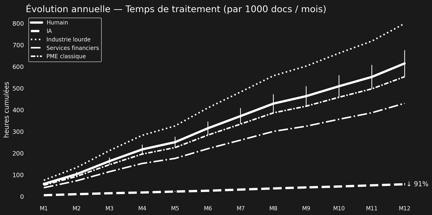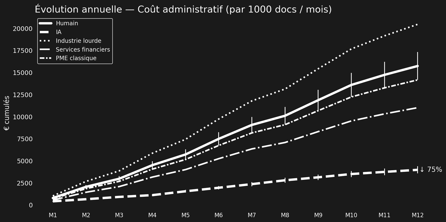 Coût administratif Humain : 20–30 €/h → 600–2000 €/1000 docs. TravoIA : 200–500 €/1000 docs (abonnement/licence + serveur).